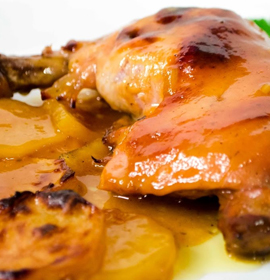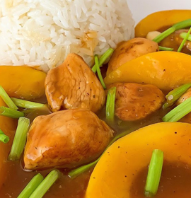 POLLO AL DURAZNO Filete de pollo en trozos, marinado y sazonado, mezclado con trozos de durazno y el mágico sabor peruano. $9.000