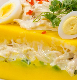 CAUSA DE POLLO Pastel de puré de papa, rellena con ensalada de pollo y el mágico sabor peruano. $8.000-